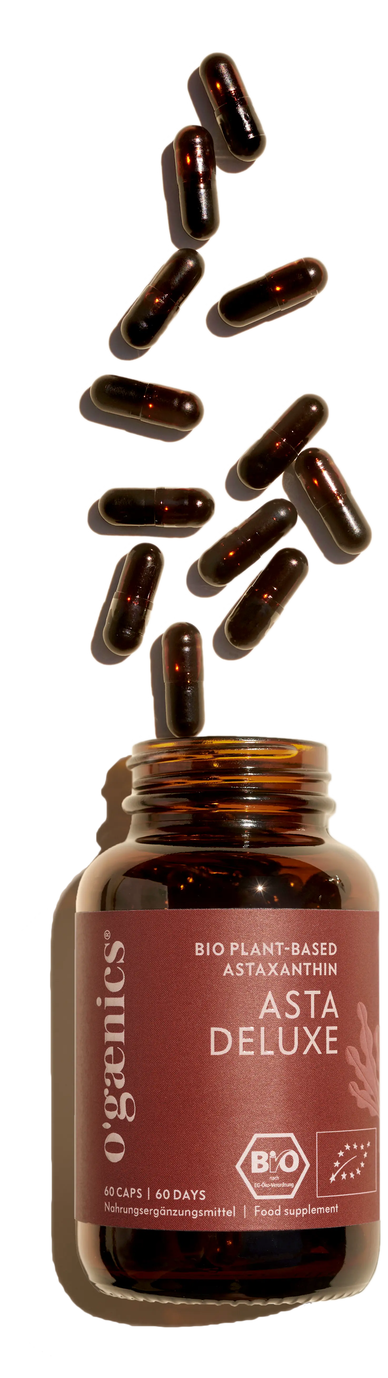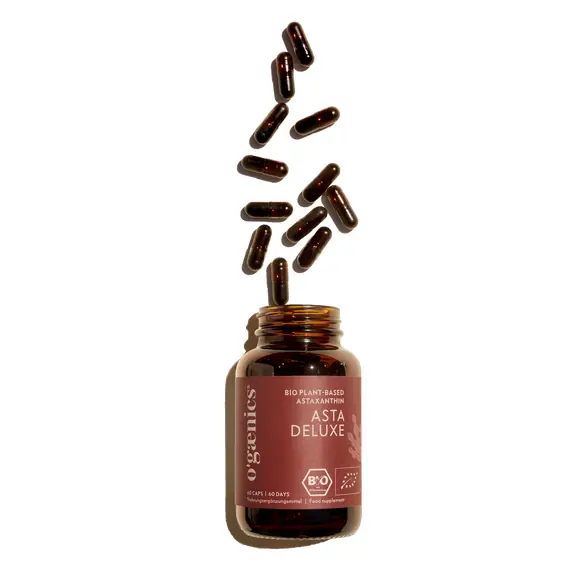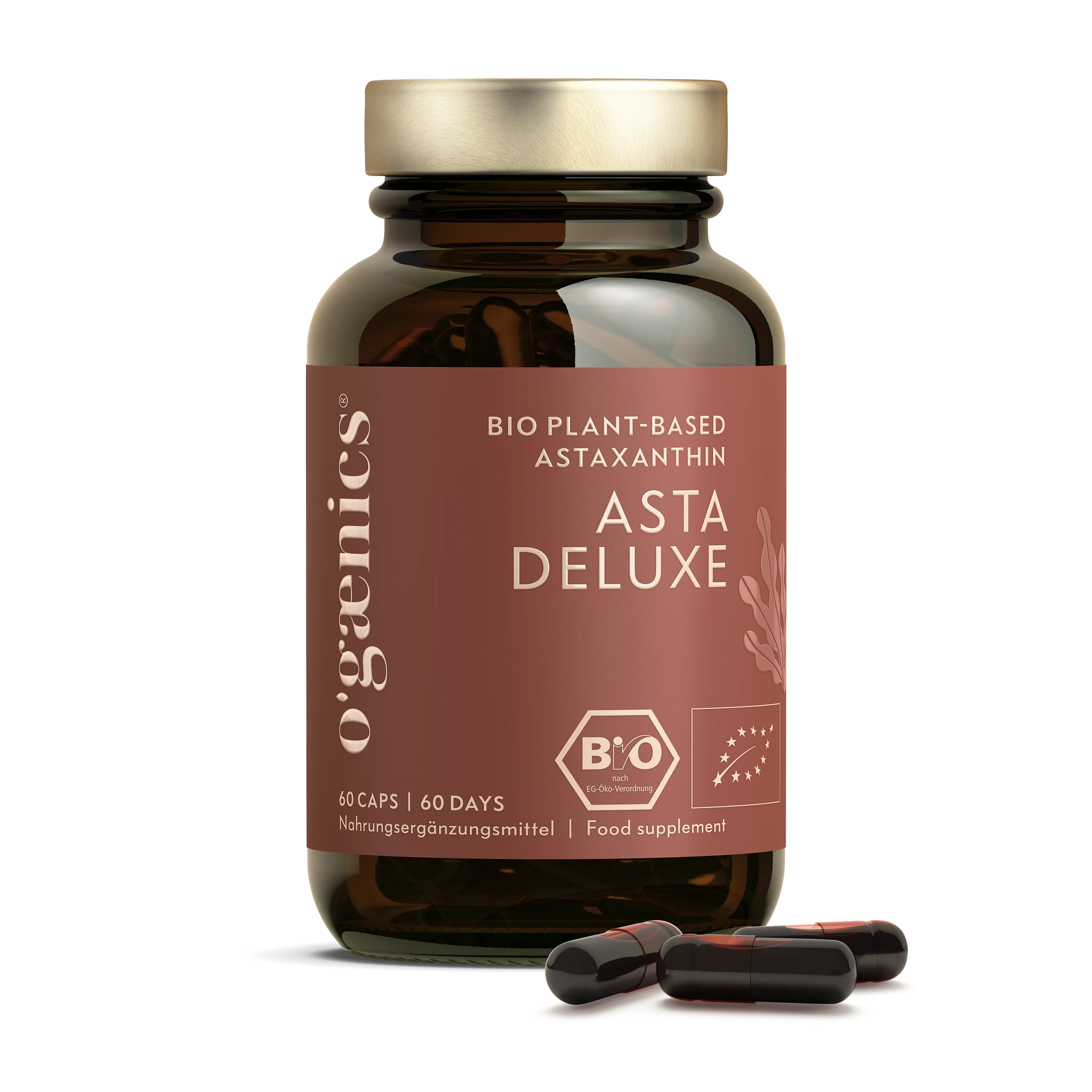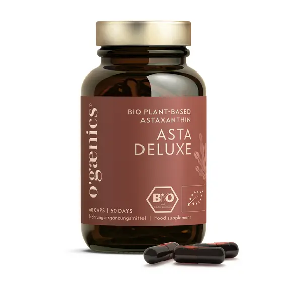 Natural astaxanthin of the highest organic quality: Asta Deluxe provides you with 8 mg of organic astaxanthin per capsule per day from the microalgae Haematococcus pluvialis.