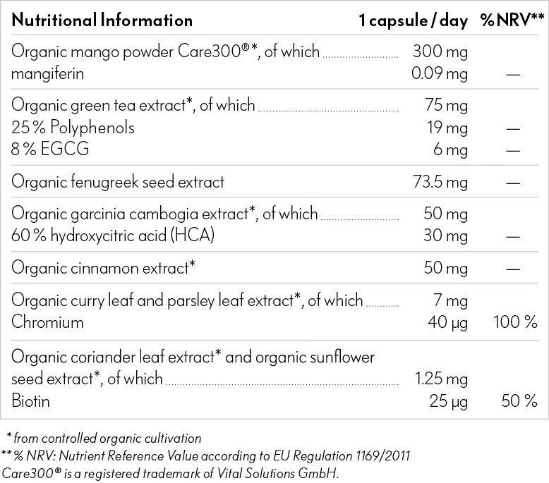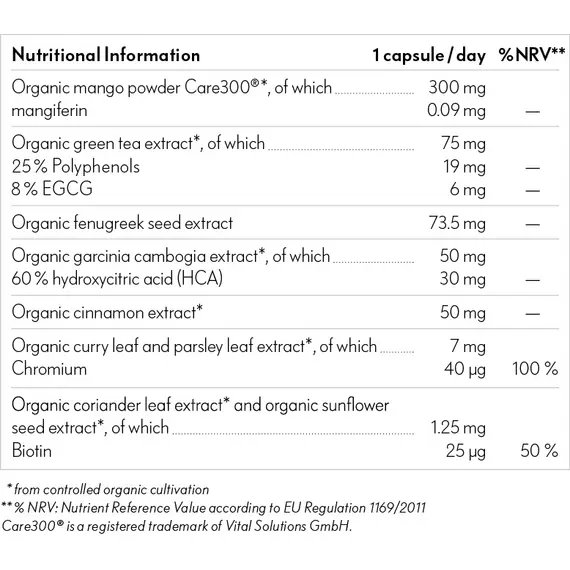 Chromium also contributes to maintaining normal blood sugar levels. Organic green tea, organic fenugreek seed extract, organic garcinia cambogia and organic cinnamon extract complete the formula.