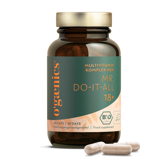 Mr. Do-It-All 18+ is the daily premium organic multivitamin for men 18 years and older. It provides a daily complete supply of all essential natural vitamins, minerals and antioxidants from organic fruits, vegetables and superfoods in just one supplement. Mr. Do-It-All 18+ supports men in their most active phase of life with 17 natural nutrients and antioxidants from organic plants and the super antioxidant SOD.