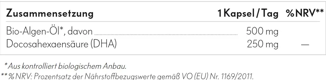 Obtained from the algae Schizochytrium sp., sustainably cultivated and in certified organic quality, this vegan formula provides 250 mg of bioactive DHA per capsule in its best possible absorption form – without any fishy aftertaste and with a planet-friendly footprint.