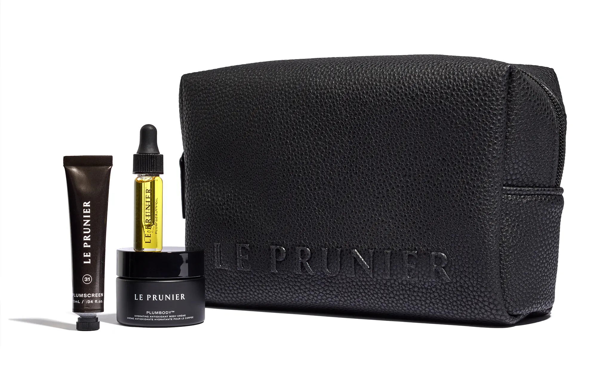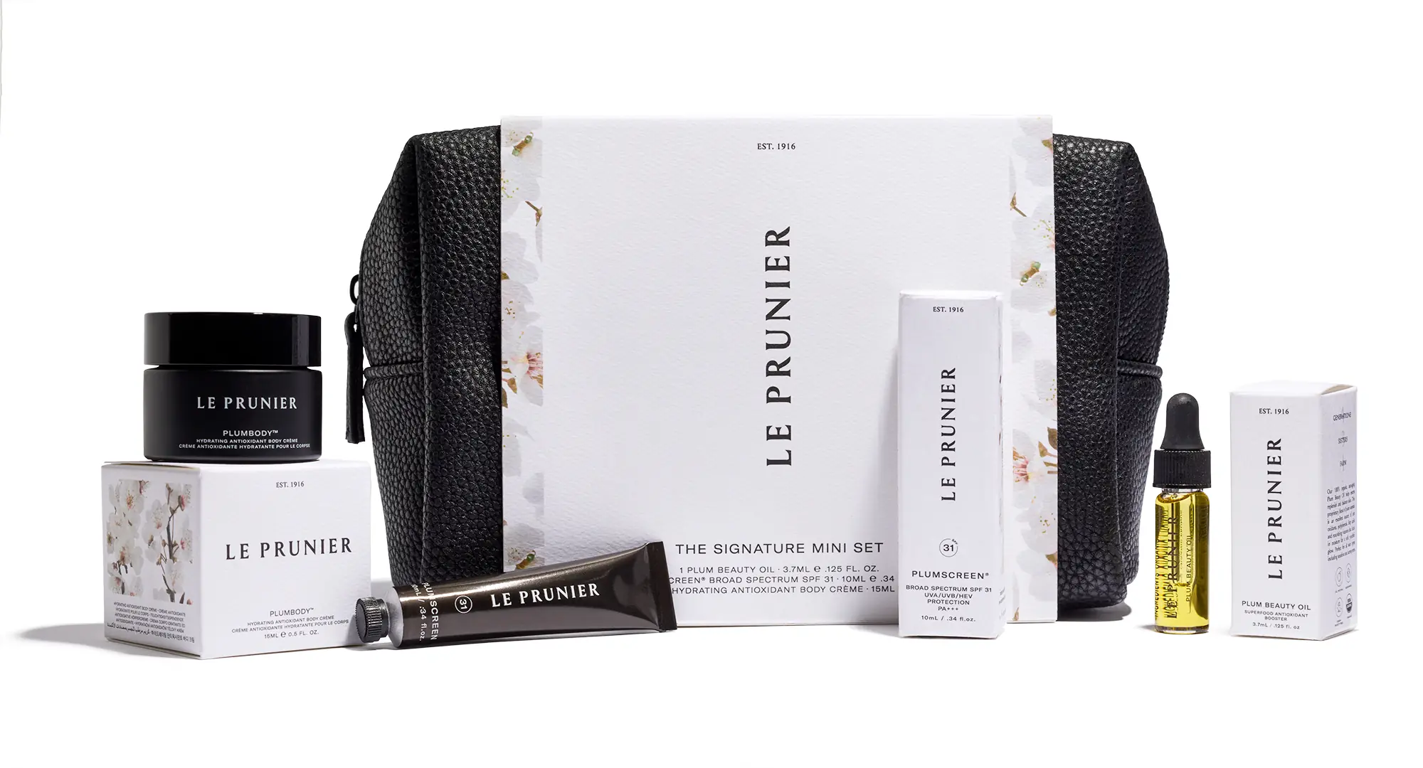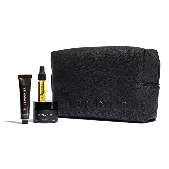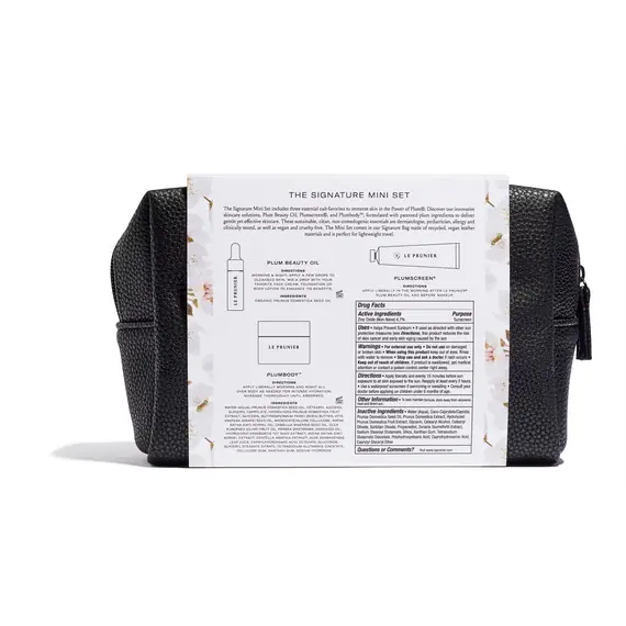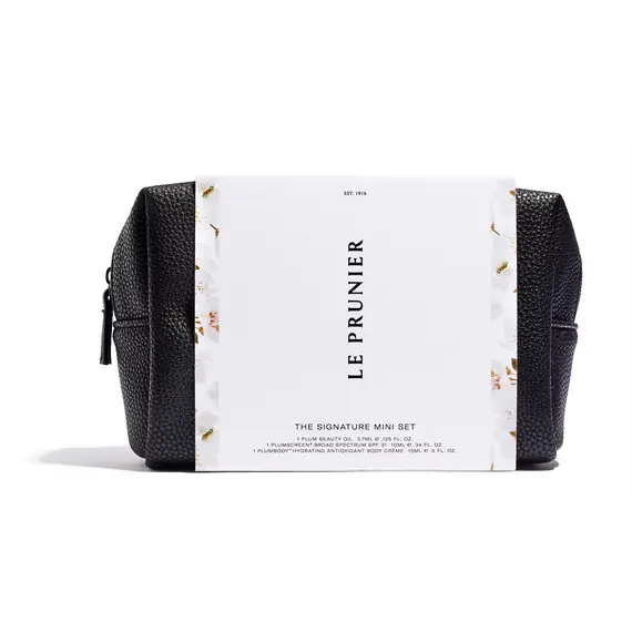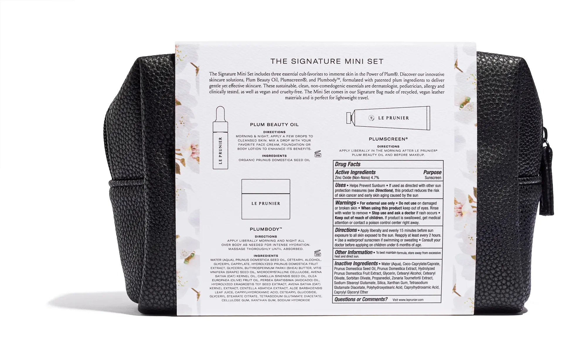 The Signature Mini Set includes three essential Le Prunier cult-favorites to immerse skin in the Power of Plum®. Discover innovative skincare solutions, Plum Beauty Oil, Plumscreen®, and Plumbody™, formulated with patented plum ingredients to deliver gentle yet effective skincare. All of these sustainable, clean, non-comedogenic essentials are dermatologist, pediatrician, allergy and clinically tested, as well as vegan and cruelty-free. The Mini Set comes in our Signature Bag made of recycled, vegan leather materials and is perfect for lightweight travel.