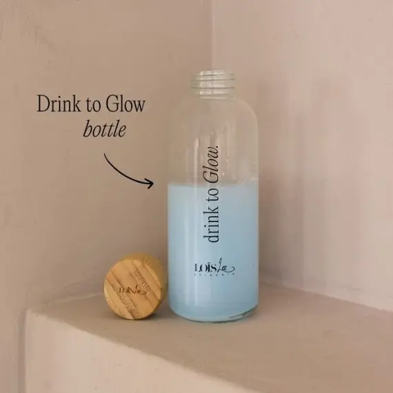 Shake it, baby! Strudy, 600 ml reusable, leakproof glass bottle with woodplated capThis limited edition Drink to Glow glass drinking bottle is ideal for use with the Lois Lee Skin Electrolytes, but of course also any other drink!