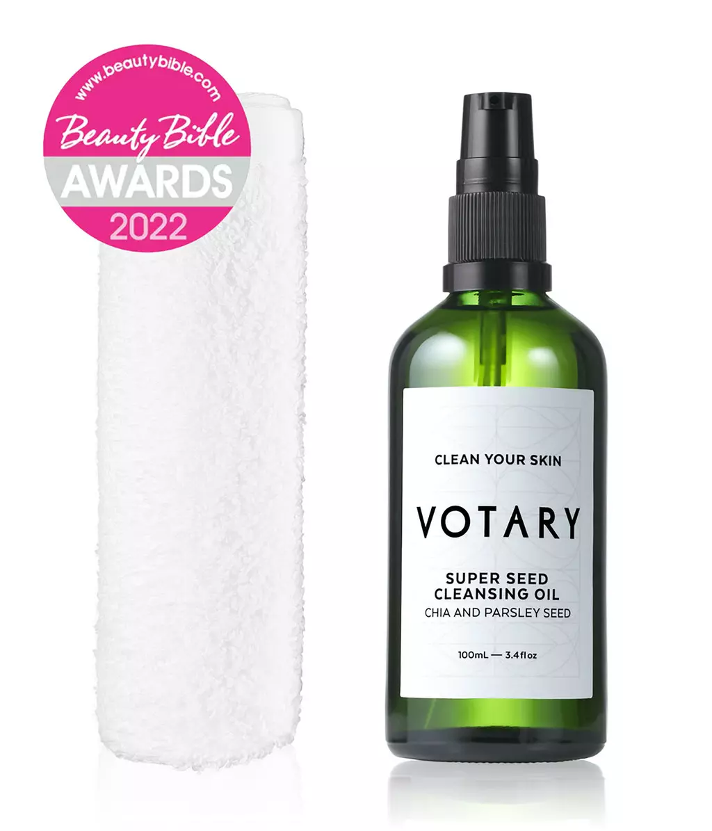 Votary Super Seed Cleansing Oil va acompañado de una toallita facial de algodón 100%.