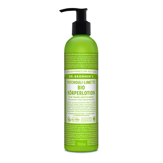 La lotion pour le corps patchouli & citron vert du Dr Bronner contient de l'huile de jojoba biologique pour hydrater les peaux sèches