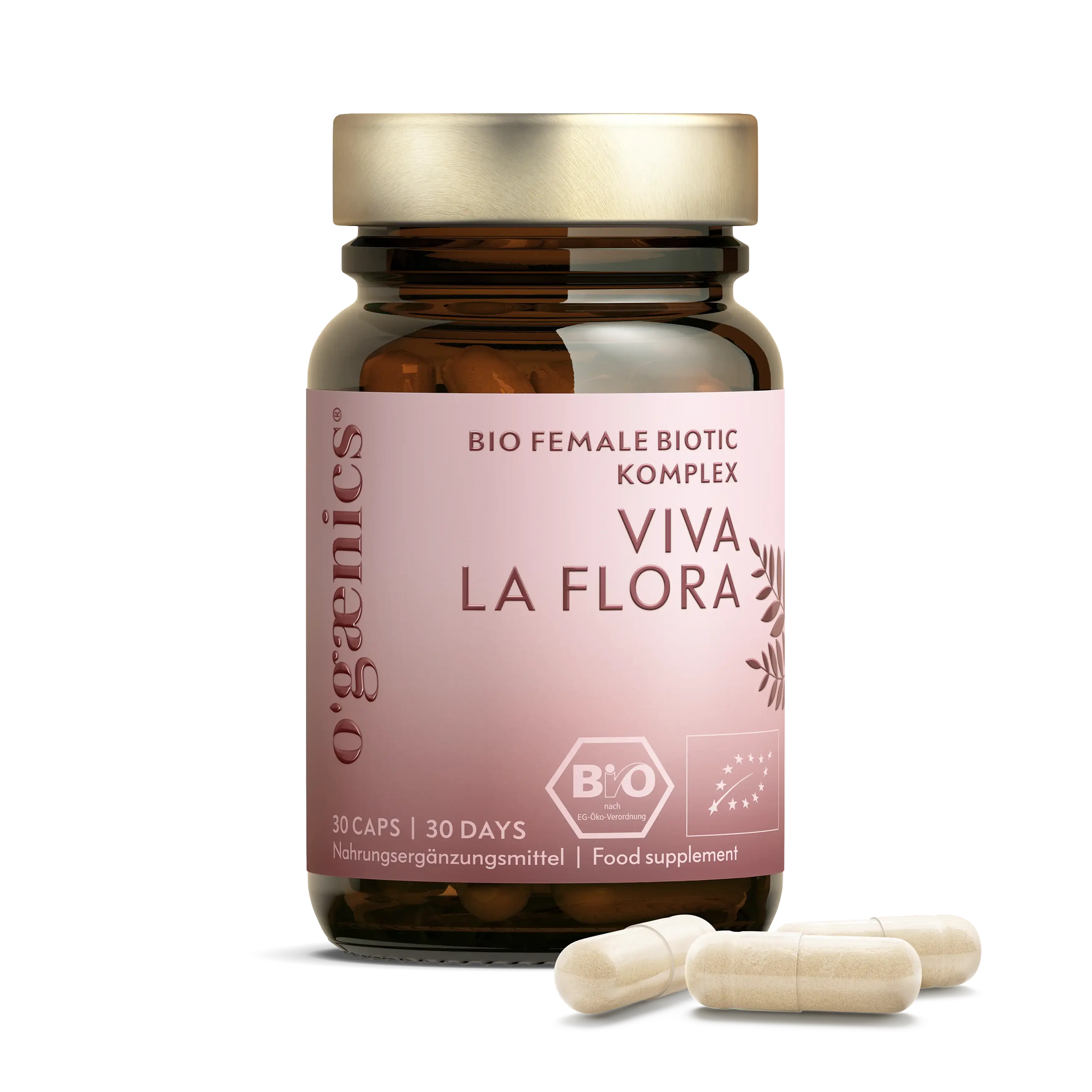 Viva La Flora - le premier complexe biotique féminin certifié bio. Conçu pour ta flore vaginale et ton bien-être féminin. Avec le SynbÆctive® Femme Blend breveté - 3 cultures bactériennes validées cliniquement et très étudiées, de la biotine naturelle bio pour la peau, les cheveux, les ongles et les muqueuses et de la fibre d’acacia bio comme source de fibres douces. Validé cliniquement, certifié bio, 100% végan et sans additifs - conçu pour les femmes à chaque étape de leur vie.