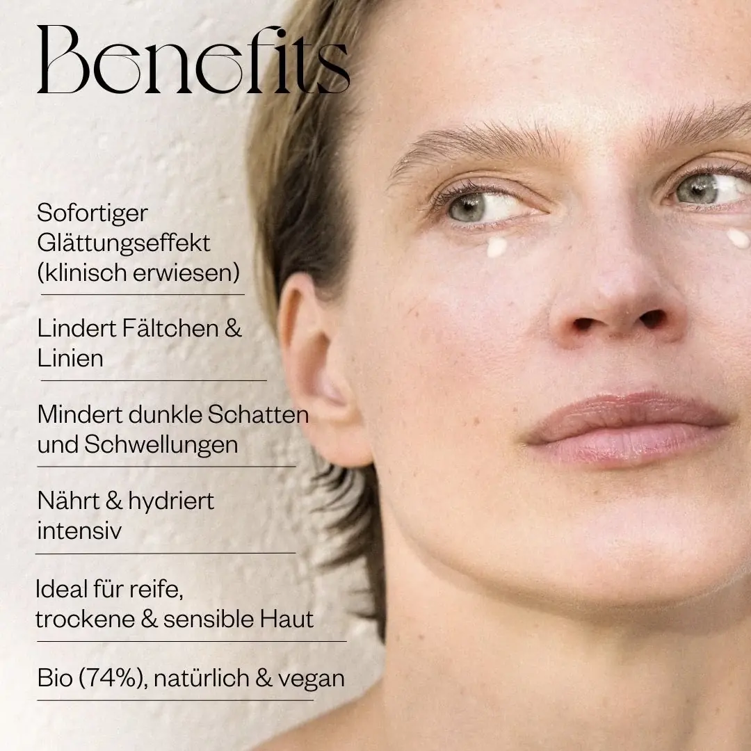 Wichtig: Nur eine kleine, linsengroße Menge auf die Fingerspitze geben und sanft um die Augenpartie einmassieren – das Serum ist besonders reichhaltig, daher reicht eine kleine Menge völlig aus. Direkten Kontakt mit den Augen vermeiden.