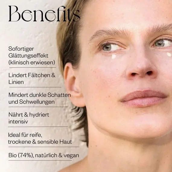 Ceramide stärken die zarte Haut um die Augen und unterstützen die Feuchtigkeitsspeicherung, während Bio-Extrakt aus grünen Arabica Kaffeebohnen abschwellend und erfrischend wirkt und für einen wachen Blick sorgt. Rotalgenextrakt, reich an Astaxanthin, und Schmetterlingsflieder wirken stark antioxidativ und schützen die empfindliche Augenhaut vor freien Radikalen und blauem Licht.