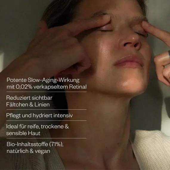 The Retinal Eye Cream is a firming slow-aging eye care with a delicately melting, rich texture and an organic content of 71% – ideal for even the most demanding skin. It combines the latest active ingredient technology with selected natural ingredients to visibly smooth, protect, and regenerate your delicate eye area.